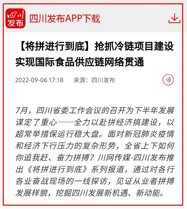 8月中旬,四川發布記者來到項目現場實地采訪,感受羞羞的视频下载冷鏈一線建設者的拚搏熱情和奮鬥精神。9月6日,報道正式發布。